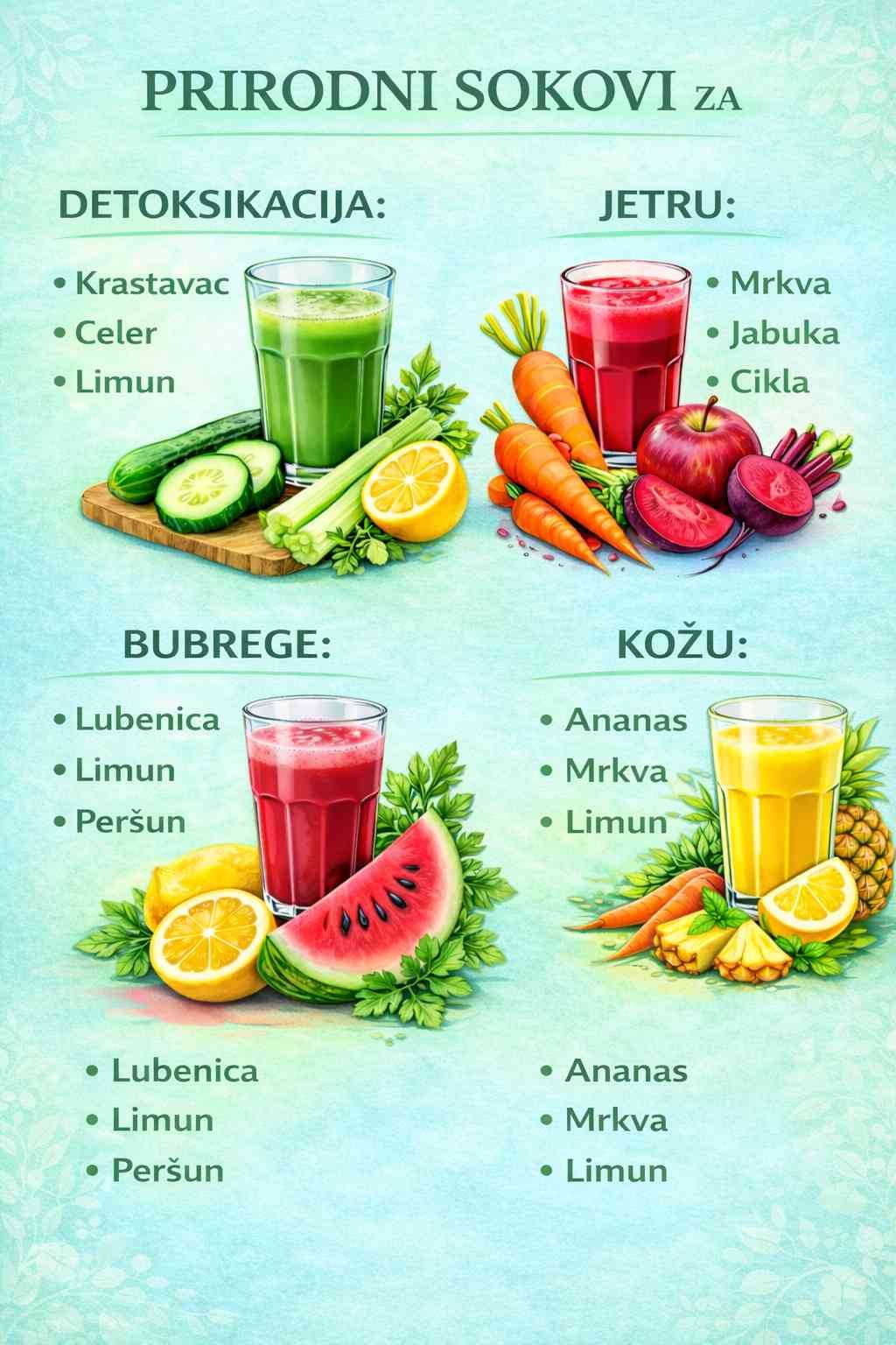 Prednosti: Lubenica ima visok sadržaj vode i potiče hidrataciju, peršun ima prirodni diuretički učinak, a limun podržava urinarni sistem. Može pomoći u eliminaciji otpadnih proizvoda putem urina i doprinijeti zdravlju bubrega.