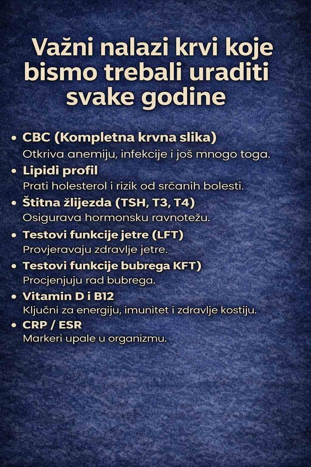 Redovne analize krvi jedan su od najjednostavnijih i najefikasnijih načina da na vrijeme otkrijemo moguće zdravstvene probleme. Čak i kada se osjećamo potpuno zdravo, krv može pokazati prve znakove poremećaja u organizmu. Upravo zato ljekari preporučuju da se određeni nalazi provjeravaju barem jednom godišnje.