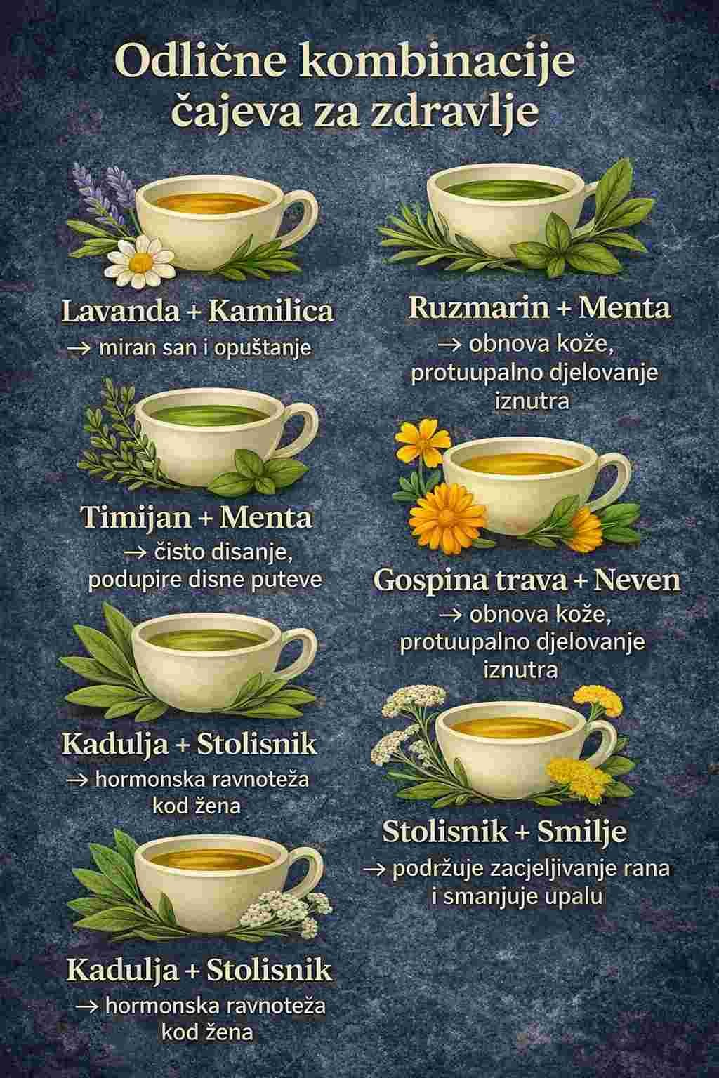 Ovo su samo neki od mnogobrojni, ljekoviti čajevi koji su veoma korisni za zdravlje jer uspješno pobjeđuju želučane tegobe, nadutost, prehladu i gripu, migrene, mučnine te pročišćuju vaš organizam u potpunosti. Od davnina su biljke čovjekov prvi saveznik u očuvanju zdravlja i prvi lijek protiv svih vrsta bolesti.