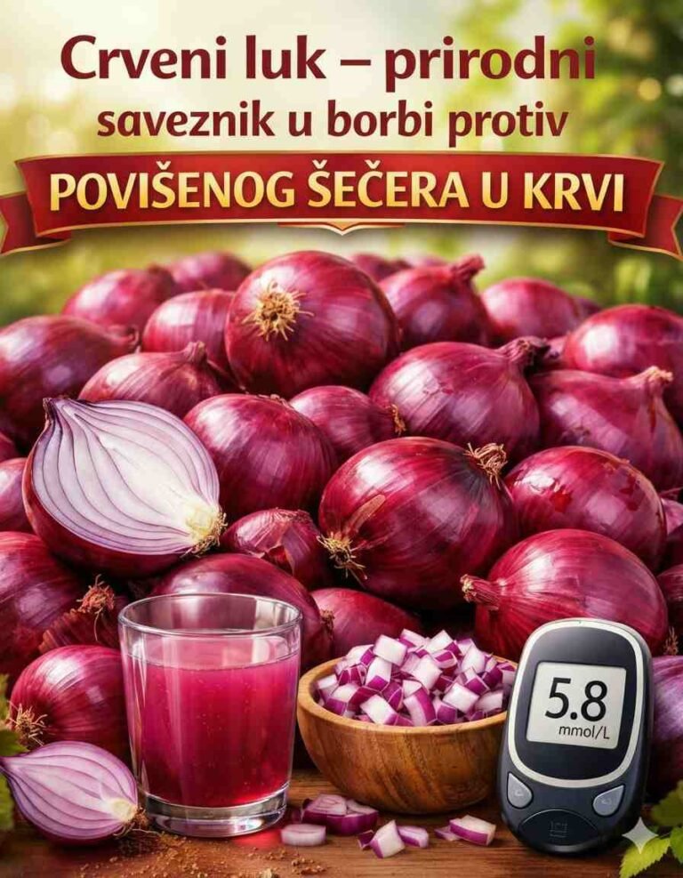 Slika prikazuje vizuelno savršenu kompoziciju: gomilu svežeg crvenog luka, čašu jarko ljubičastog soka (koji deluje više kao umetnička interpretacija nego…