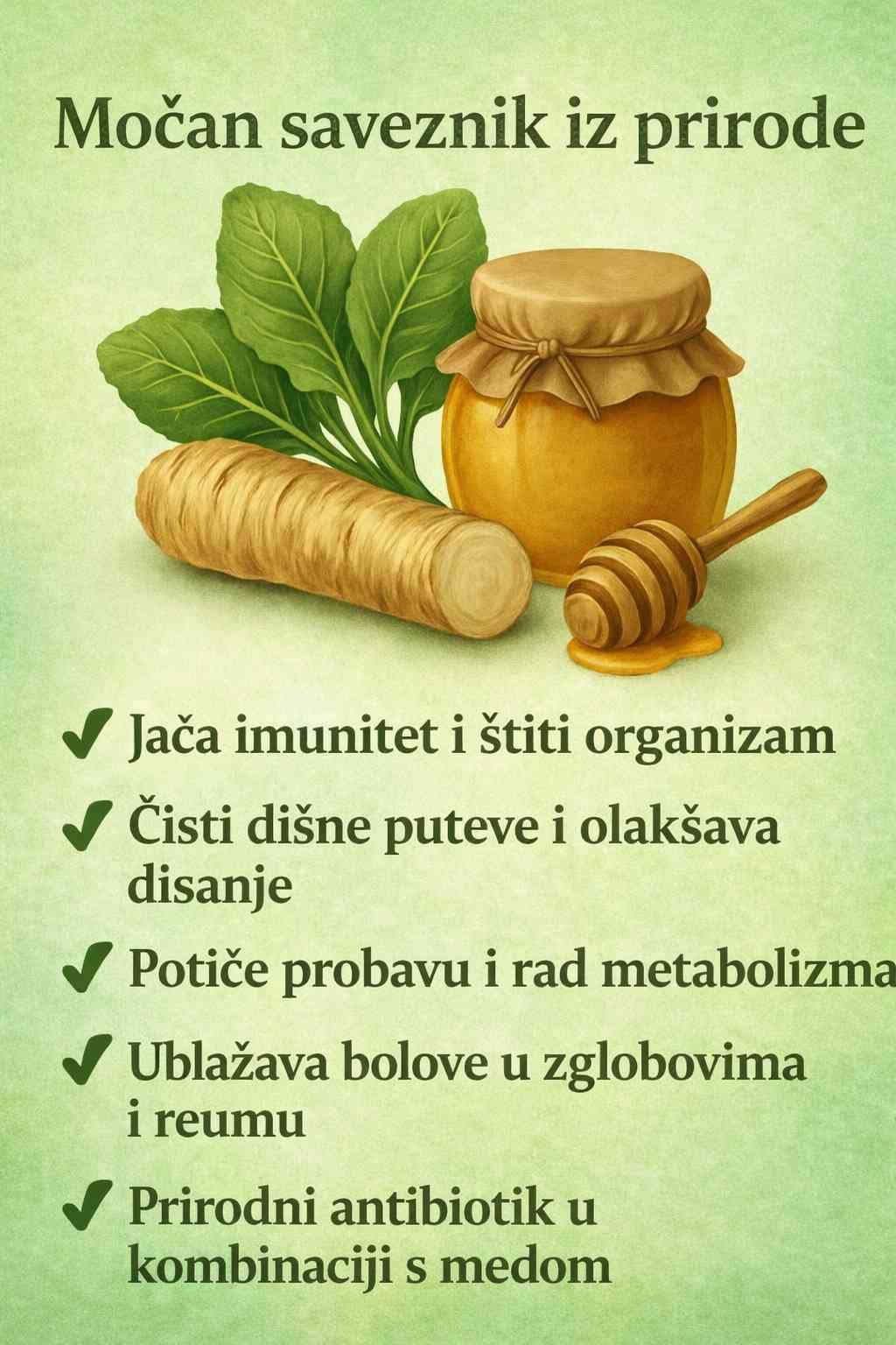 Jedna od najpoznatijih kombinacija u narodnoj medicini je hren i med. Ova mješavina se često naziva prirodnim antibiotikom, jer pomaže kod kašlja, prehlade i začepljenih sinusa. Med umiruje grlo i djeluje antibakterijski, dok hren otvara dišne puteve i olakšava izbacivanje službe.