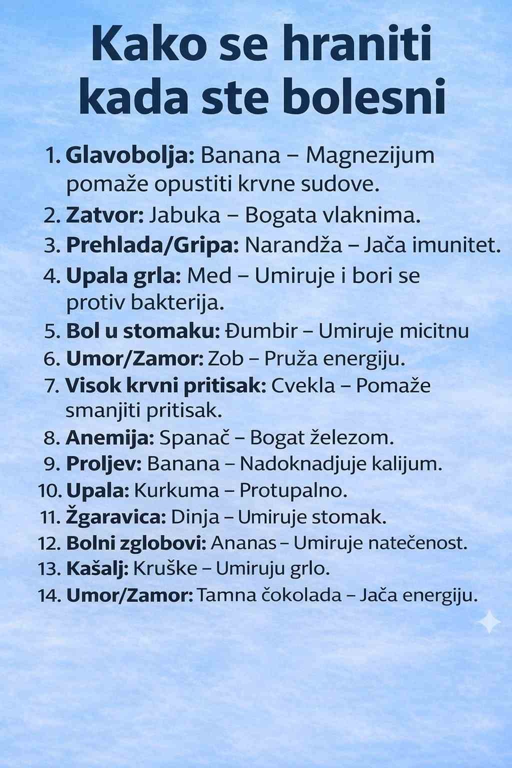 Kada smo bolesni, naše telo treba dodatnu energiju, vitamine i minerale kako bi se brže oporavilo. Pravilna ishrana može značajno pomoći u ublažavanju simptoma i jačanju imunog sistema. Postoje određene namirnice koje posebno pomažu kod različitih zdravstvenih problema.