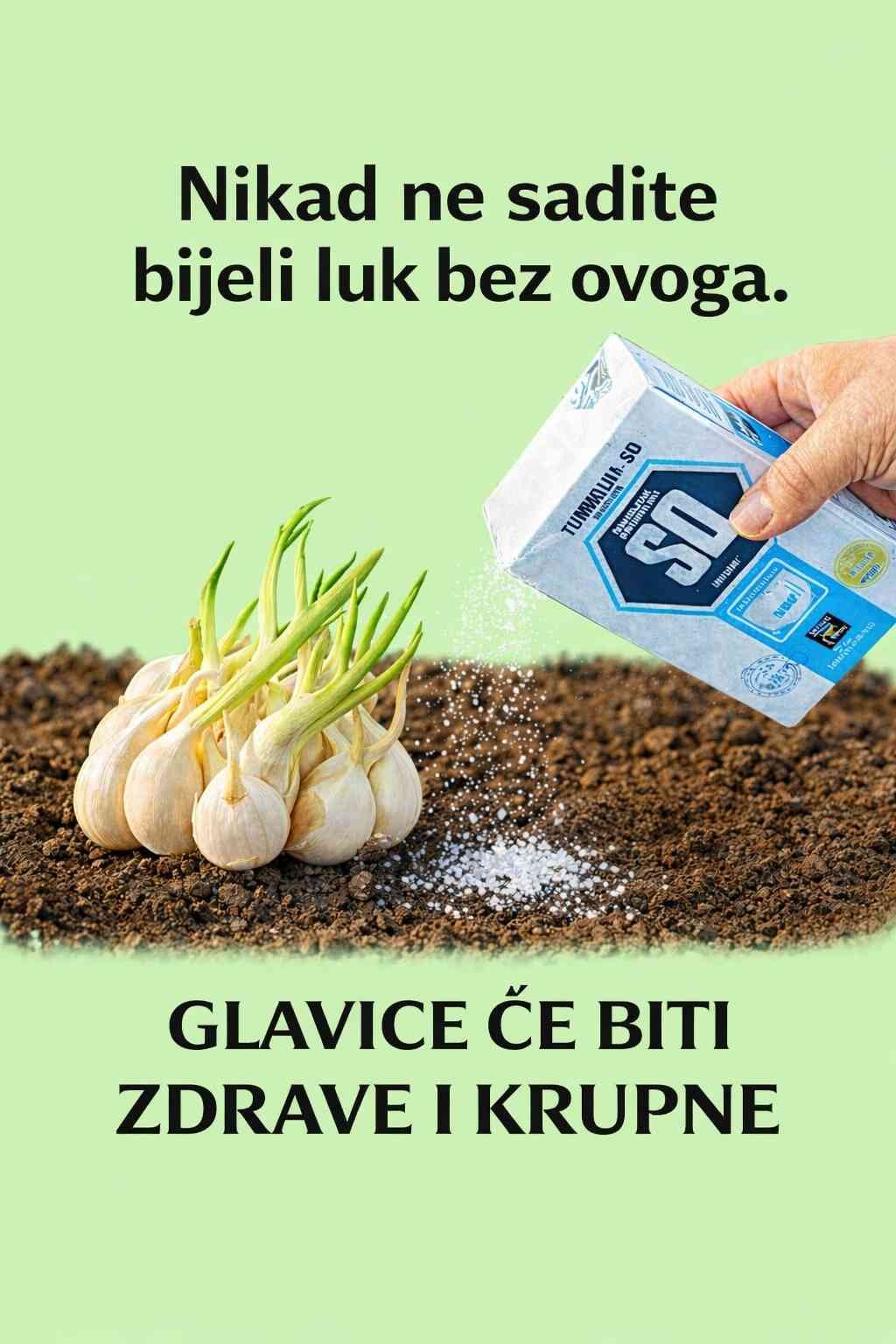 Bijeli luk je jedna od najmoćnijih prirodnih namirnica, široko poznata po svojoj ljekovitoj i nutritivnoj vrijednosti. Slika ističe jednostavan savjet za vrtlarstvo – dodavanje male količine soli prilikom sadnje bijelog luka – za koji se vjeruje da poboljšava rast i proizvodi jače i zdravije lukovice. Ali osim vrtlarstva, sam bijeli luk nudi širok spektar zdravstvenih prednosti koje ga čine bitnim dijelom svakodnevnog života.