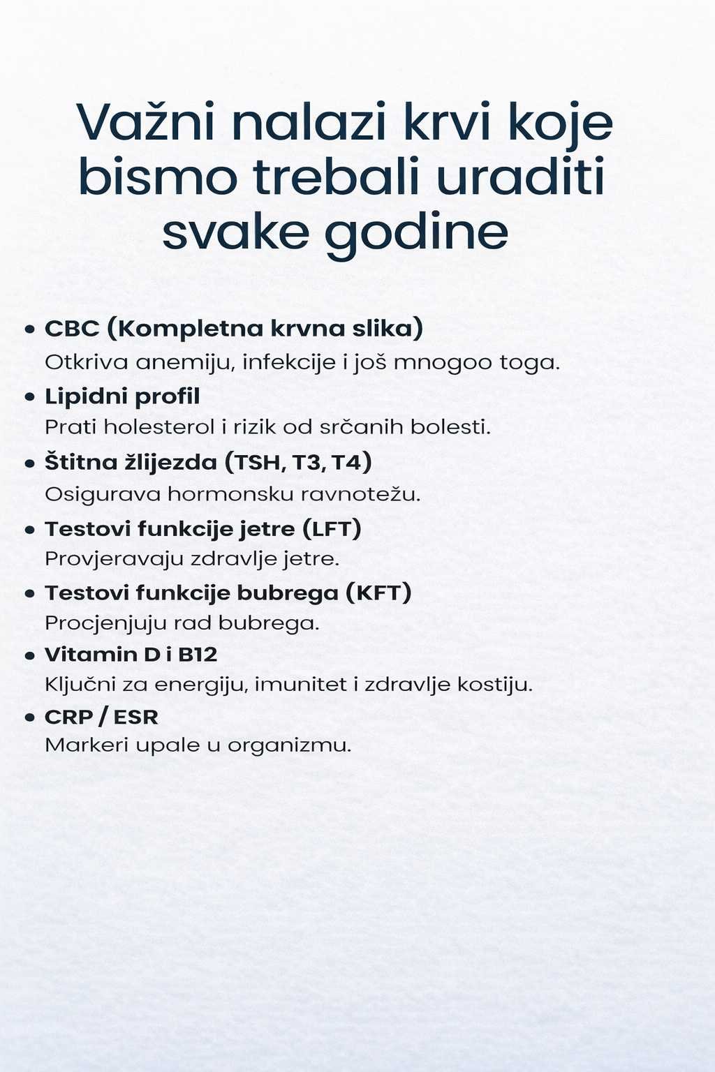 Ovaj test daje opšti uvid u stanje krvi. Pomaže u otkrivanju anemije, infekcija i drugih poremećaja. Posebno je važan ako se često osjećate umorno ili iscrpljeno.