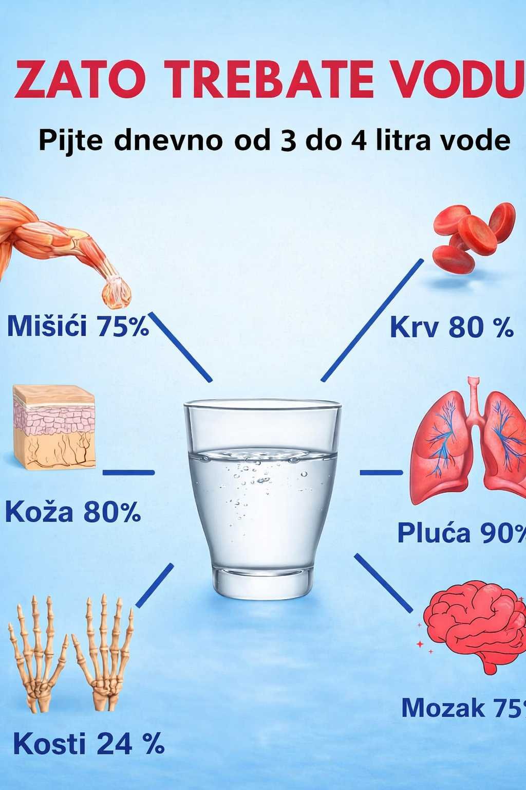 Iako se često činim i jednostavnim, voda obično utiče na sve — od raspoloženja, koncentracije i varenja, pa do zdravlja kože, mišića i kostiju. Čak i mala dehidracija može poremetiti ove procese, zato je redovan unos vode ključa za dobro zdravlje.